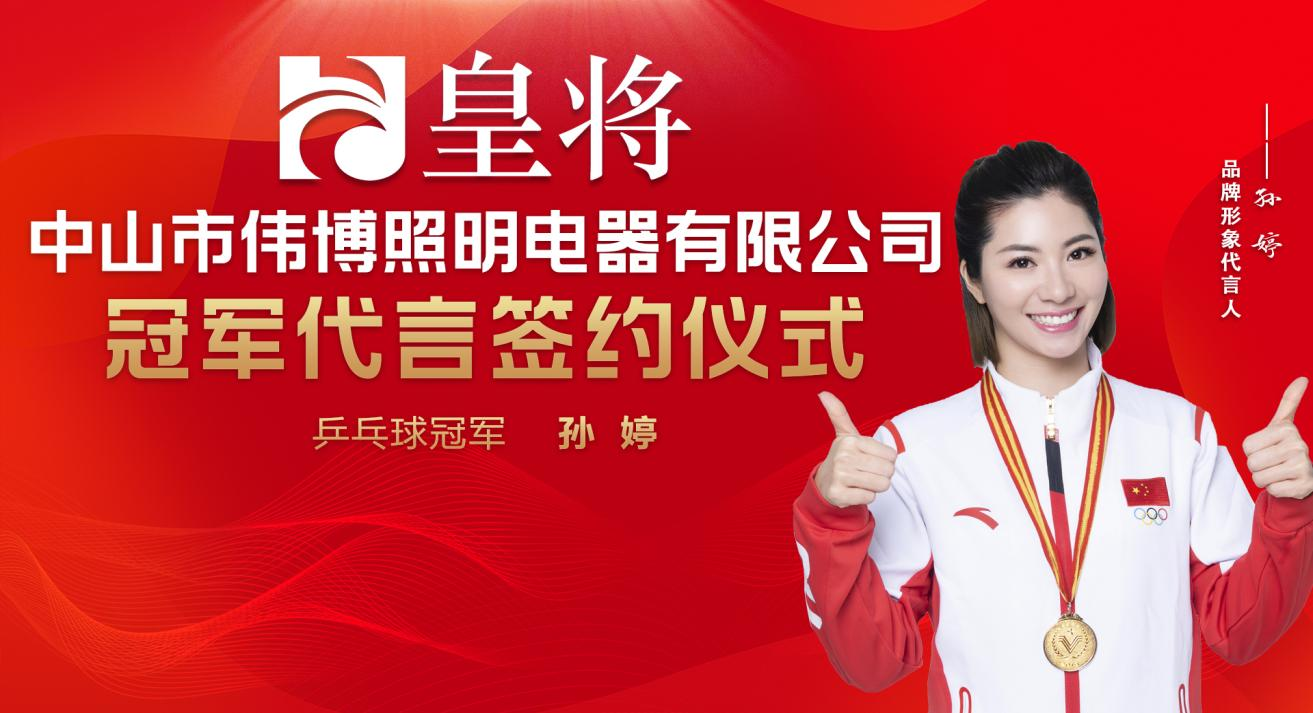 9月12日,中山市伟博照明电器有限公司旗下品牌“皇将”通过经纪猎人代言经纪公司成功签约乒乓球冠军孙婷为品牌代言人,开启品牌新征程。