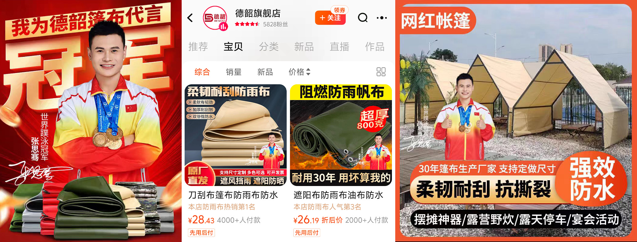 大家伙快来买世界冠军代言的蓬布吧,保准不漏水哦
