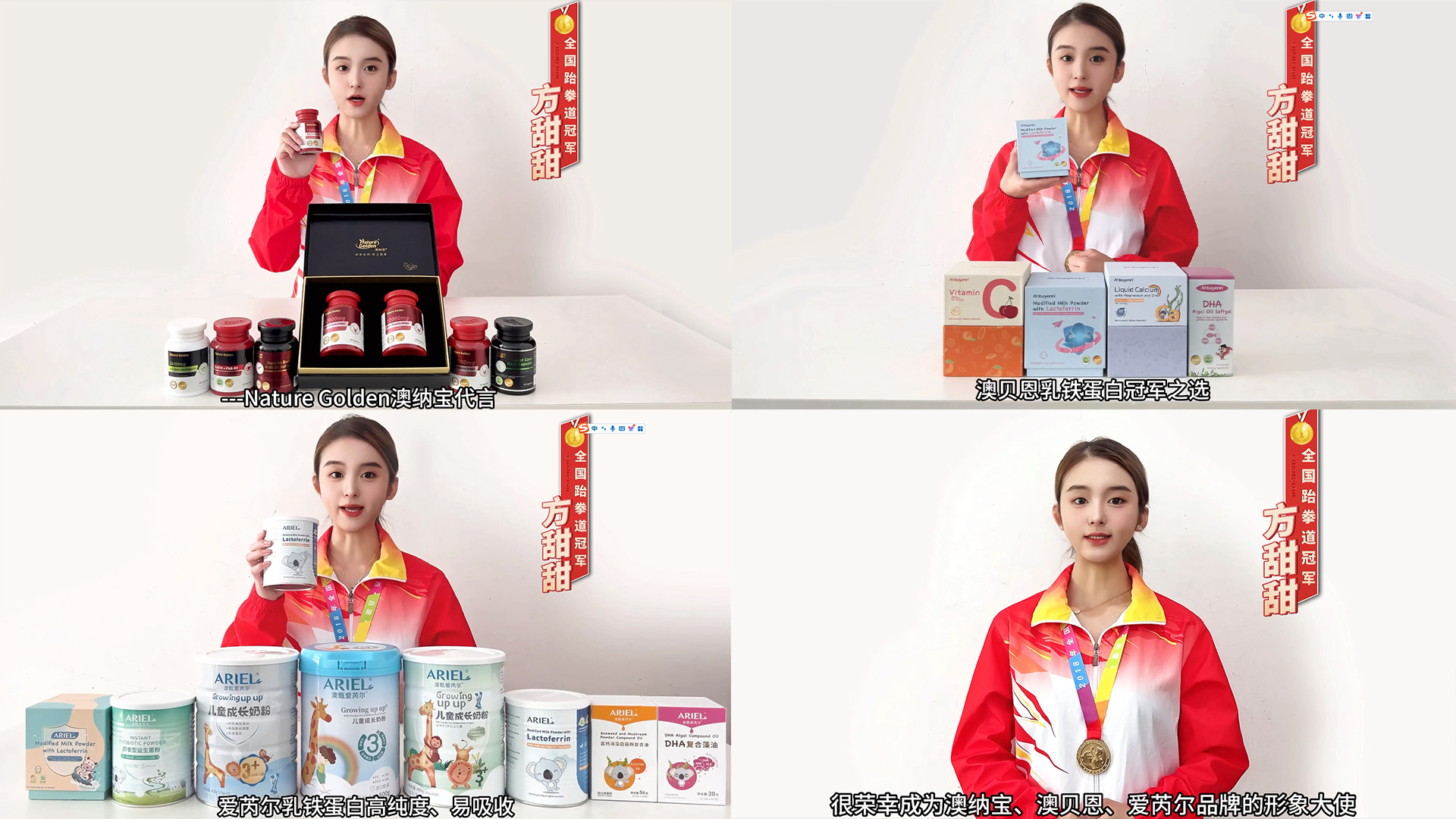 咱的冠军方甜甜,一直以来都以坚韧不拔的精神和健康活力的形象示人。她代言的这三个澳甄爱芮尔、澳贝恩、澳纳宝品牌,也一定会给大家带来健康和活力。快来试试吧,和方甜甜一起,开启健康生活新旅程!